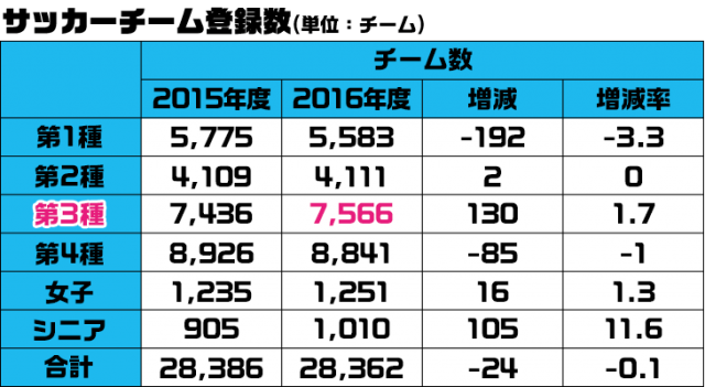 そもそも中学でサッカーを続けるにはどんな方法があるのでしょうか? まずはそこから説明を始めましょう。公益財団法人 日本サッカー協会(JFA)によると、2016年度の第3種(中学年代)のチーム登録数は7,566となっています。ちなみに第4種(小学年代)のチーム登録数は8,841で、年代別にみても非常に登録チームが多いことがわかります。