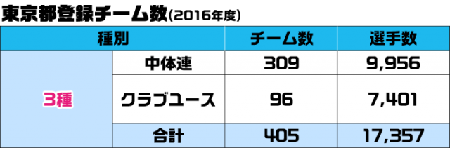 中学年代のサッカー環境は大きく2つに分けられます。 東京を例に中学年代のチーム内訳をみていきましょう。 東京都サッカー協会HPによると2016年度の総チーム数は405チーム(選手数17,357人)で、中体連が309、クラブチームが96の3:1の比率になります。それぞれ所属する組織が異なり、「中体連」とは簡単に説明すると中学校での部活動のことで、全国の中学校体育連盟サッカー専門部の所属となります。「クラブチーム」というのは、Jリーグクラブのアカデミーから、各地域に根づく“街クラブ”まで、さまざまなレベルのクラブが存在し、各地域のサッカー協会(FA)に所属します。