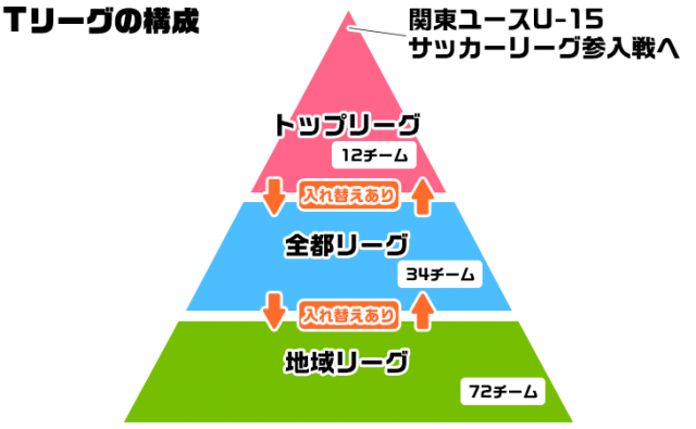 中学校の部活と違い、クラブチームは複数あるチームから「選択する」ことができます。選べる権利がある以上、その選択肢を知ることがまずは必要になります。ここではクラブチームを中心に中学サッカーの構造を紹介していきましょう。 先に述べた「高円宮杯全日本ユース(U-15)サッカー選手権大会」、「日本クラブユースサッカー選手権(U-15)」が全国規模の大会となりますが、この出場権にも影響するリーグ戦が、各地域にて1年を通じて行われています。東京を例に見てみましょう。 東京都に登録されたクラブチーム・中体連が参加するリーグ戦が「東京都ユース(U15)サッカーリーグ (通称「Tリーグ」)」です。トップリーグ(1部リーグ)を頂点に、全都リーグ(2部リーグ)、地域リーグ(3部リーグ)の3部構成で、全118チーム(2017年)で構成されています。リーグは3月から11月にかけ行われます。1~3部それぞれの成績によって降格・昇格の入れ替えがあり、一部では過酷な“入れ替え戦”も行われます。この入れ替え戦は、3年生ではなく、次年を戦う2年生(U-14)のチームが試合を行うことになります。