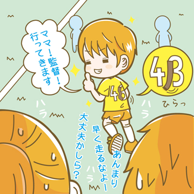 日々の練習に励み、試合当日を迎えたA 君。いざユニフォームに着替えると、なんか大きい…。なんと、間違えて自分のではなくお兄ちゃんのユニフォームを持ってきてしまったのです!