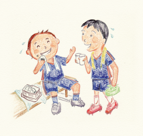 また、練習後の30分間は「カラダづくりのゴールデンタイム」と言われるほど大切な時間です。疲労を修復する炭水化物(糖質)とたんぱく質を食べるのがベスト。 飲むヨーグルトと果物、牛乳とアンパンの組み合わせや、具が入ったシャケおにぎりや照り焼きサンドイッチなどは、手軽に食べられるのでおすすめです。