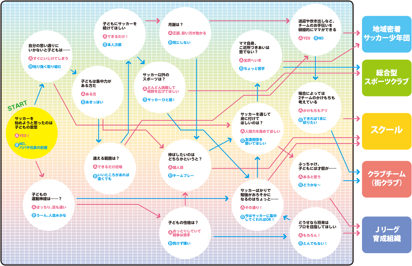 そこでさまざまな方向から、チーム選びのヒントを特集。まずは目的や環境、お子さんの特徴からぴったりなカテゴリーを導き出してみましょう。チームの移籍を考えているママも必読ですよ!