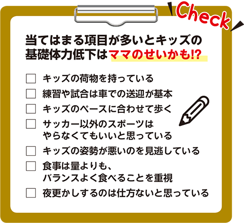 また、「サッカーをしているから、うちの子は体力がある!」と思っているのは大きな間違いです。スポーツをすることで、昔は当たり前だった平均的な基礎体力を獲得できているのであって、サッカ ーをしているなら、それ以上の体力があ ってこそ。サッカー力を高めるためにも、まずは基礎体力をつける習慣を身につけていきましょう。