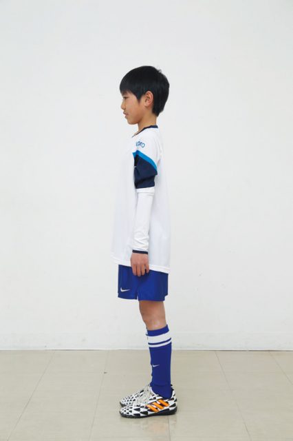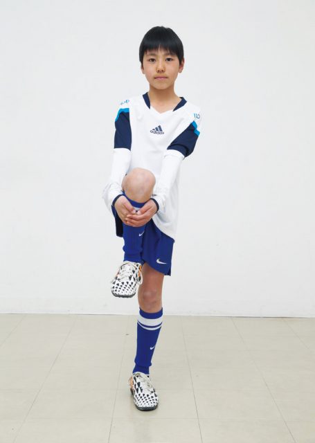 片脚を胸の前に引き付けて、両手で膝を抱えてみよう。ぐらぐらせずに、真っ直ぐな姿勢で10秒以上キープできれば、バランス感覚はまずまず。ただし、サッカージュニアなら30秒以上は保てるようになろう!