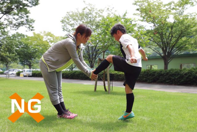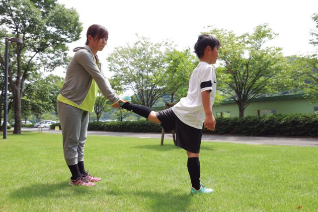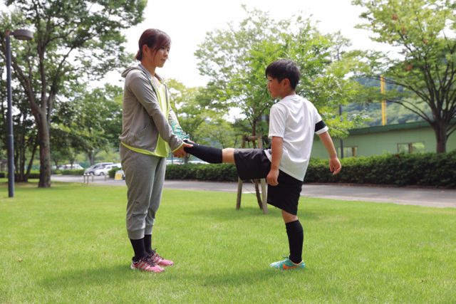 ①キッズは身体の後ろに脚をのばし、親はキッズの片脚をしっかり持つ。
