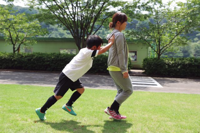 ③さらに、親は少しずつ後ろに下がるくらい、力を入れる。キッズは親を押しながら10mほど前にダッシュする。2~3セット行う。