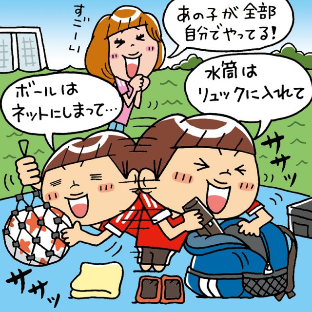 夏合宿のスタイルはチームによってさまざまですが、自分の持ち物を自分で管理することが基本です。 そのおかげで、普段は自分の荷物を管理するのが苦手だったキッズたちも、夏合宿に行ったあとは大変身するそう。家に戻ってから「普段は口うるさく言わないと何もしなかったのに、練習の用意を自らやっていた !」「自分で出したゲームや本を元の場所にしまうようになった」といった意見が多数。特に低学年の場合は、高学年が合宿中にきちんと自分で管理していることに刺激を受けて、自分でもやるようになるとのことです。
