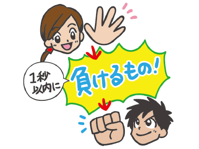 キッズは、親(または友達)がだしたジャンケンに負けるものを1秒以内に出す。右手、左手3回ずつを繰り返そう。