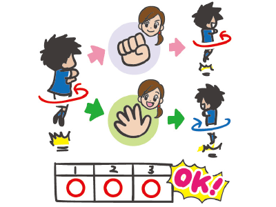 - ママと向かい合って立ち、その場で一回転ジャンプ。ママがグーなら同じ方向、パーなら反対方向に一回転ジャンプする。3回連続成功すればOK。