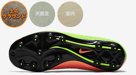 柔らかく滑りやすい天然芝の上でプレーできるように、スタッドは高く、数が少ないのが特徴です。これにより、一本のスタッドにかかる体重の比重を大きくし、地面に食い込みやすくなっています。