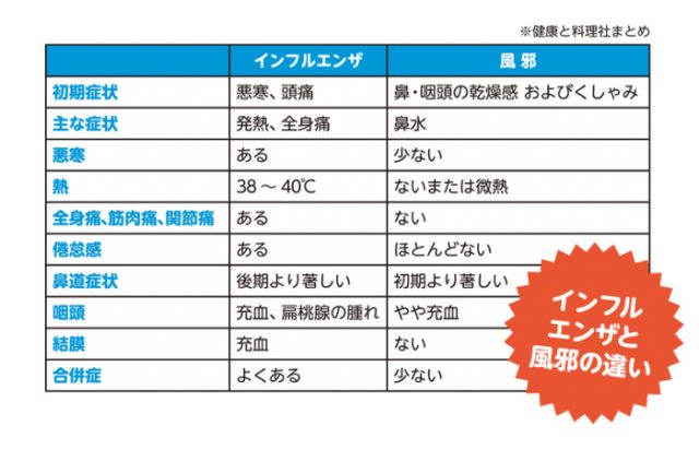 風邪の主な原因は、空気や人の手を介して感染するウィルス。その種類は、細かく分類すると200種類にも及ぶと言われています。ウィルスに感染すると鼻やのどなどが炎症を起こし、くしゃみや鼻水などさまざまな症状が現れます。なかでも「インフルエンザ」は悪性で感染力が強く、普通の「風邪」とは区別して扱われます。感染力が強いため一気に広がりやすく、肺炎や脳炎といった重い合併症につながる恐れもあるのがインフルエンザの怖いところ。感染を防ぐために、日頃からうがいと手洗いの心がけが大切です。インフルエンザと風邪の症状は違いがあるので(表を参照)、急な発熱や悪寒の症状が出た場合は、早めに病院を受診しましょう。