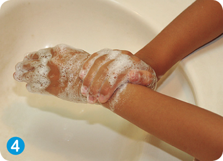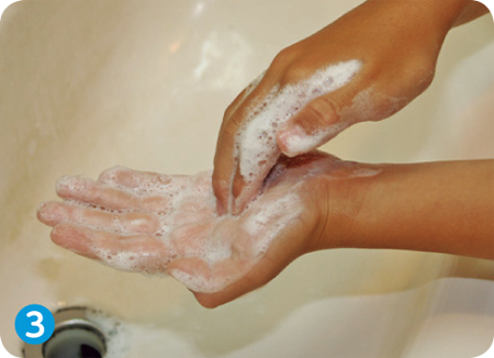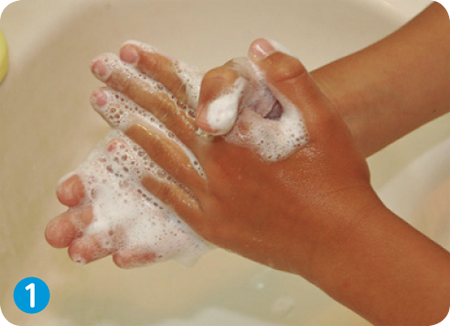 ①両手を水で濡らし石けんなどを手にとった後、両手のひらをよくこする。