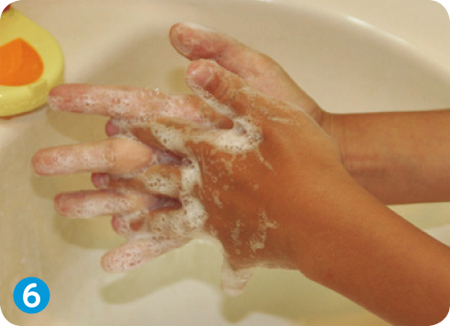 ⑥指と指の間をよく洗う。