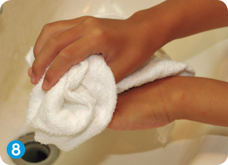 ⑧清潔なハンカチやタオルで拭いて、手を完全に乾かす。