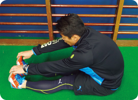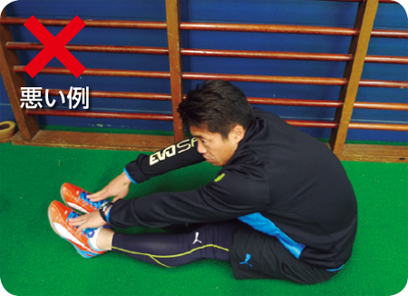 ①姿勢を伸ばし、長座をする。 ②つま先を上に向ける。 ③つま先または足首・すねを持ち、お腹を太ももに近づけたり、離したりする。 一言アドバイス つま先は伸ばさない。頭ではなく、お腹を太ももに近づける。膝を曲げない。