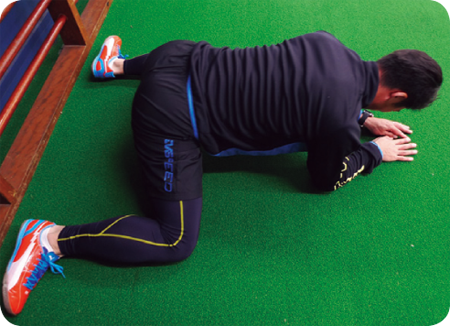 ①うつ伏せになる。 ②両膝の内側と前腕を地面につけ、自分の体を支える。 ③②の状態から背中を前後にスライドし、股関節の内側を伸ばす。 一言アドバイス 膝と足首の角度が直角になるようにする。背中を丸めない。