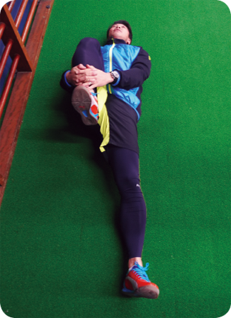 ①姿勢をまっすぐにして仰向けに寝る。 ②一方の膝を曲げ、両手ですねを抱え頭に近づける。 ③②を足を変えて行う。 一言アドバイス つま先は伸ばさない。