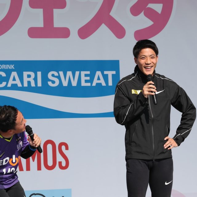 広島県出身の陸上選手、山縣亮太氏がステージに登壇。速く走るコツなどを話していただき、大いに盛り上がりました。