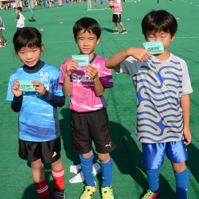 飛び入りで何度でも参加できるサッカーチャレンジ。3連勝するともらえるウタマロ石けん本品を目指し、リピートするキッズが多数。
