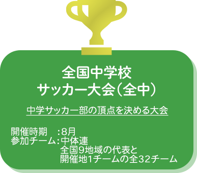 もう一つの“真夏の頂上決戦”「全国中学校サッカー大会(全中)」は、毎年8月の同時期に全国各地にて持ち回りで開催されます。全国9地域の代表と開催地1チームを加えた全32チームによるノックアウト方式で、最大5試合を勝ち抜いたチームが全国中学校サッカーの頂点に立ちます。
