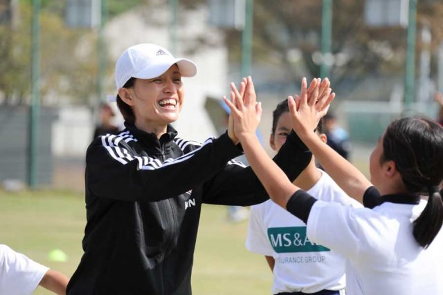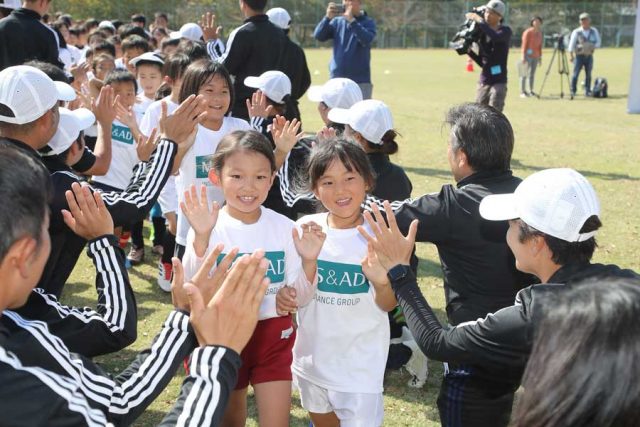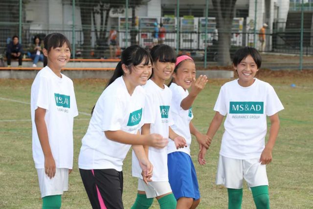 毎回、豪華なゲストコーチが登場するMS&AD サッカー教室。今回はなでしこジャパン(日本女子代表)の高倉麻子監督、元なでしこジャパンの小林弥生さん、宮間あやさんが参加。憧れの監督らに指導してもらったり、一緒にプレーできるのはこのサッカー教室だからこそ。
