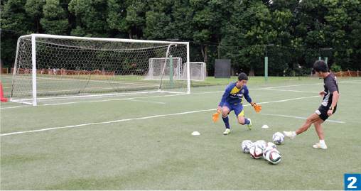 FWがドリブルしてくるタイミングで間合いをつめてシュートブロックする。ポイントは2のようにFWからボールが離れた瞬間を逃さないこと。素早くコースに入り、低い構えで対応。この練習はブロックのみだが、ドリブルにも対応できるイメージを持つこと。ドリブルされても対応可能な構えかどうか確認することもバリエーションになる。