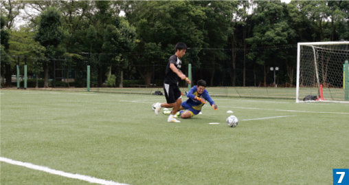 ただし、どんなにDFと連係を図っていてもラインを突破され、「一対一」になることはある。そんなとき、GKが考えなければならないのは、相手をもたつかせることだ。まずは、ボールの移動中にシュートコースを消しながらFWとの間合いを可能な限りつめ、ブロックできる状況に持ち込む。そうなると相手FWは、シュートではなくドリブルに切り替え、GKを抜きにかかる。FWにドリブル「させる」ように仕向けられれば、相手はもたつき、DFが帰陣する時間を作ることができる。これを想定の範囲内で行うことができれば失点のリスクは減らせる。