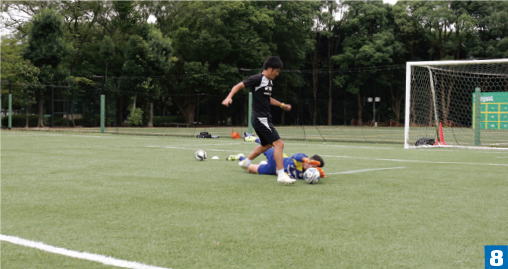 - FWとの間合いをつめた状態で基本姿勢よりも低く構える。手も低く構え、手のひらもボールへ向けることで、足下へのシュートコースを消すことができる。