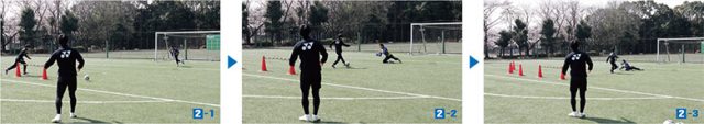 ひと言で説明すれば相手の攻撃を「予測」をすることとなるが、今回はその「予測」をより細分化して、特に「DFラインを突破してくる」FWの「コントロールとドリブル」に焦点を絞って練習する。GKは、FWが受ける「パスの種類」、突破してくるFWの「目線」、さらには「ボールの引き出し方や受け方」、「コントロールする瞬間の姿勢や雰囲気」などを判断材料に、FWの動きを瞬時に察知する(試合ではDFにコーチングして攻撃を限定)。