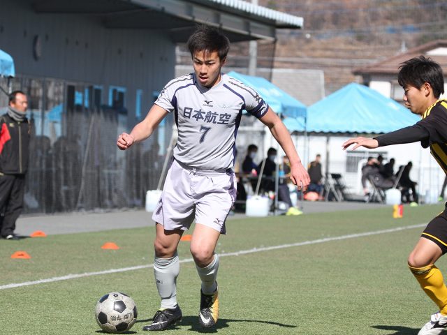 その先輩たちの活躍を刺激に、日本航空は新シーズンの山梨県内タイトル4冠を目指す。新人戦準決勝では選手権出場校の山梨学院に2-0から試合終盤の3連続失点で逆転負け。昨年、関東大会予選と県1部リーグを制していた彼らの当初の目標は山梨5冠だっただけに、悔しい敗戦となった。それでも続く東海大甲府との3位決定戦では、ポゼッションから相手の隙を逃さずに攻めて5-0で大勝。強さを見せつけた。