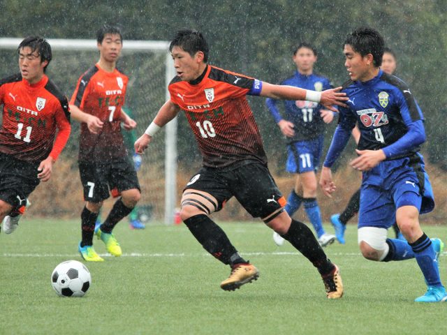 大津戦で光っていたのは各選手が強敵に対して怯まず、ファイトし続けた部分だ。強い雨の中、ボールの奪い合い、拾い合いで身体を張って対抗。相手の素早いパス交換、サイド攻撃に対して出足良く距離を詰め、ボールを引っ掛け、攻撃に繋げていた。雨の影響もあって普段よりはリスクを回避していたというものの、正確にパスを繋いでのビルドアップを披露。矢野を起点に塩田ヒロト、後藤滉稀の両翼の仕掛けなどで攻め返していた。
