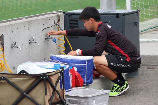 現在の業務内容は練習の準備・サポート、トレーニングウェアの洗濯、管理のほかに、試合のアウェーゲームの備品の準備を担当しています。同期で入ったJSC出身の新関はホームゲームの備品準備を担当し、互いにサポートしながら日々の業務に当っています。