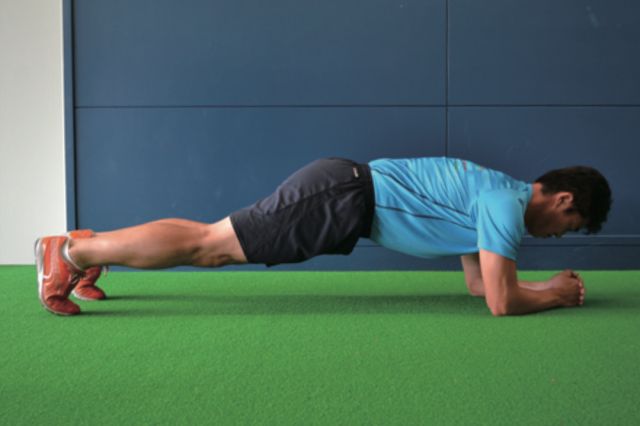 腕と足で身体を支えるのではなく、お尻の筋肉に力を入れ、正しい姿勢を保つ。足首は90度を維持する。
