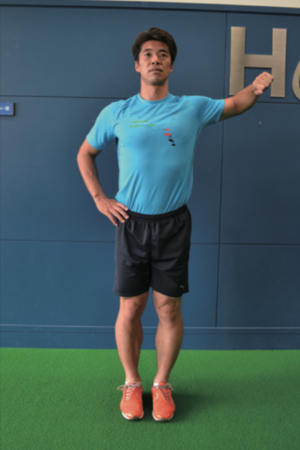 写真を見ると、右肩と左肩の位置が綺麗にそろっていることがわかる。胸を張るのもポイントの1つ。