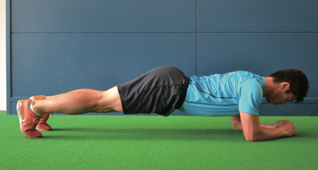 腕と足で身体を支えるのではなく、お尻の筋肉に力を入れ、正しい姿勢を保つ。足首は90度を維持する。