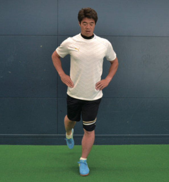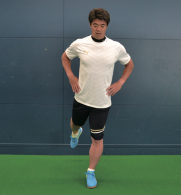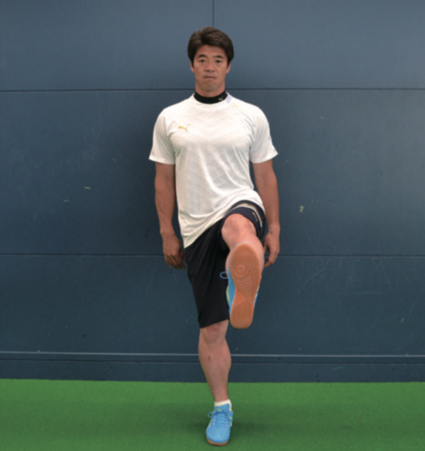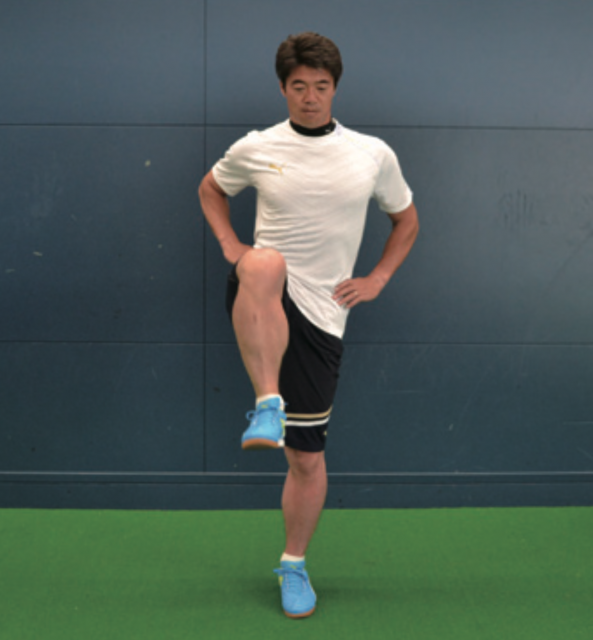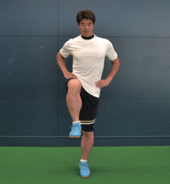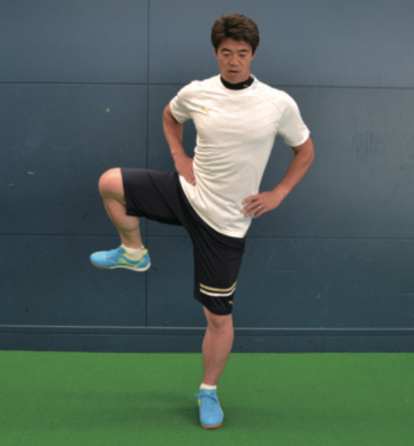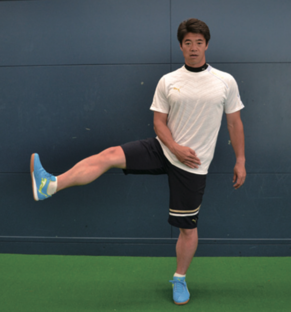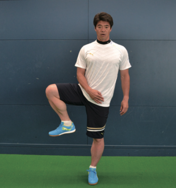 ポストプレーなどで相手を背負ってプレーするとき、一方の身体と足で相手をブロックし、もう一方の足でボールをコントロールします。そうしたときに有効なのが このトレーニング。軸足で身体のバランスを保ち、上げている足で動作を行う。膝を前後に動かす動きは、正しい姿勢でシュートするなどのプレーに有効。横に動かす 動作は股関節を動かすこともあり、まさにポストプレー時に効果的。あくまで意識は軸足で、正しい姿勢を保ち、身体のバランスを保つことを心がける。そして、上げた 足は膝の高さを変えずに動かしていく。膝下はゆっくりと動かし止めるべきところ、動かすところを意識する。