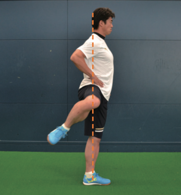 軸足で身体のバランスを保ち、上げた足を前後に動かす。膝の高さを一定に保つことがポイント。身体は軸足に沿って一直線に。