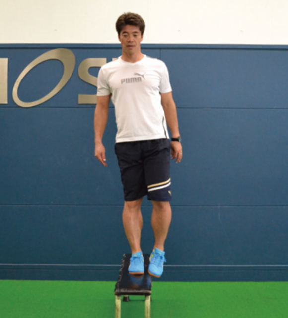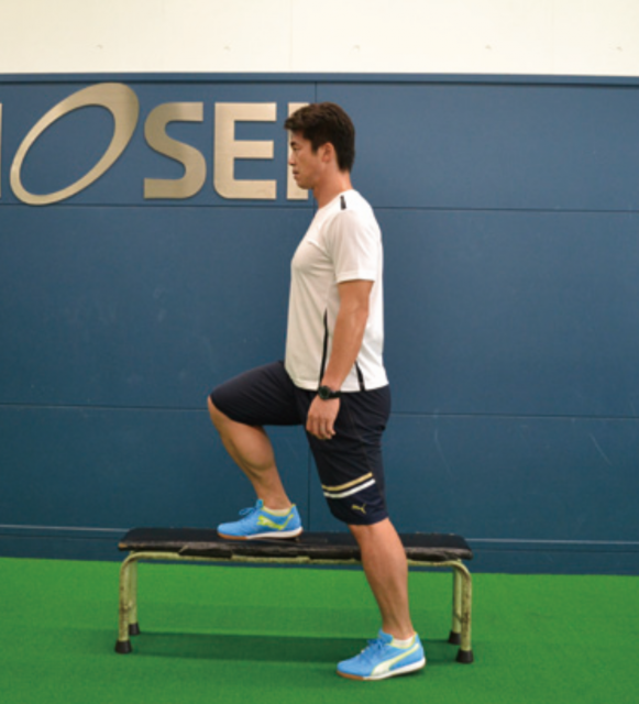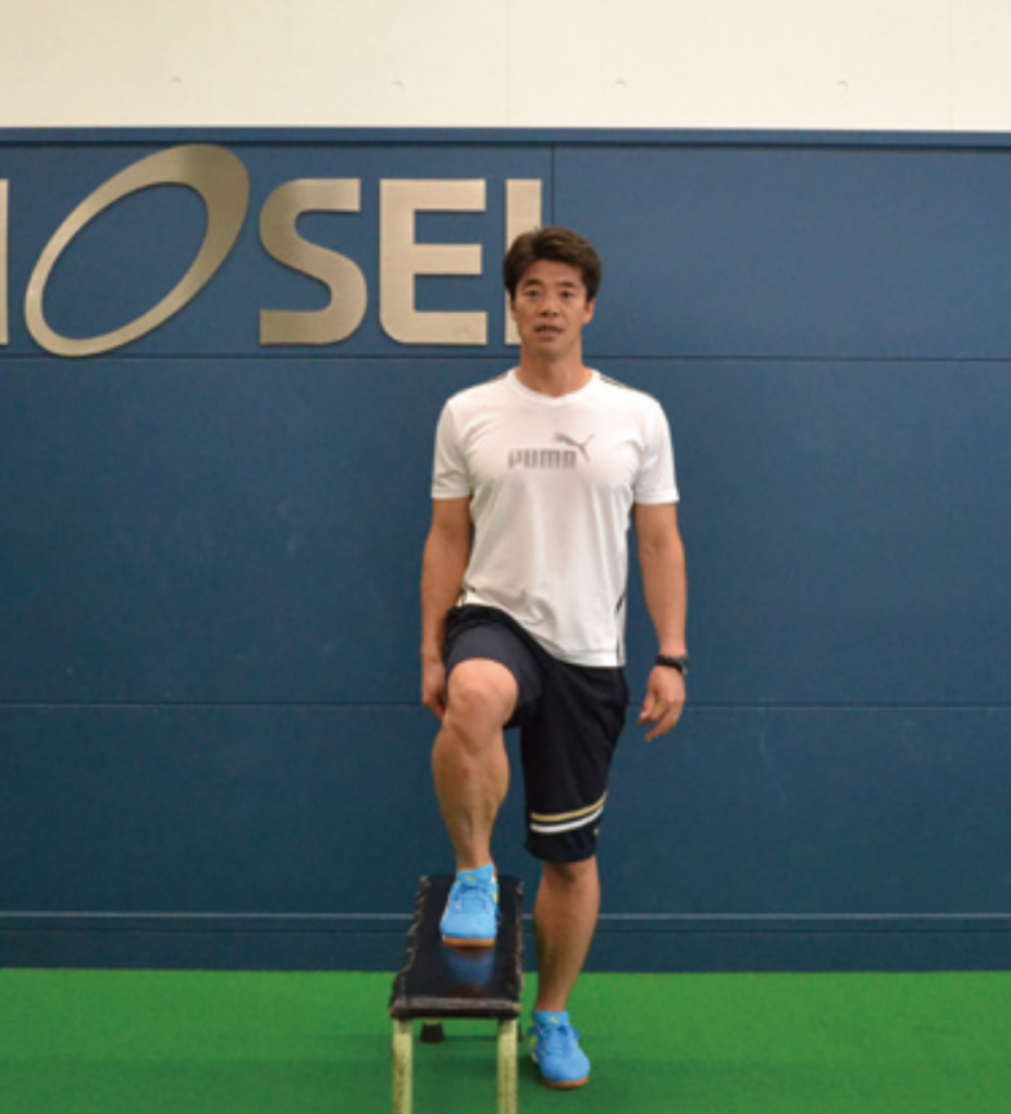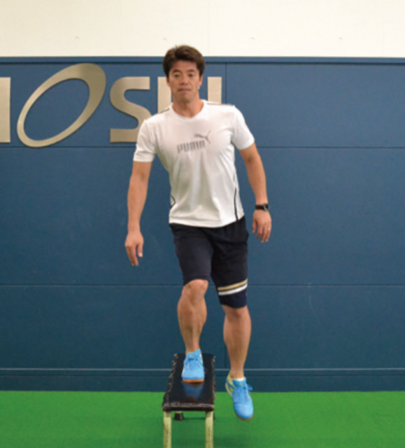 片足を台の上に乗せ、もう一方は地面につける。基本姿勢と膝が曲がらないように注意する。