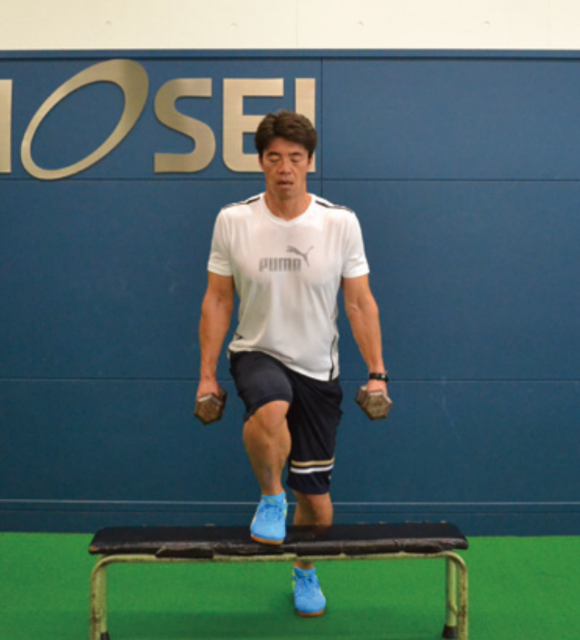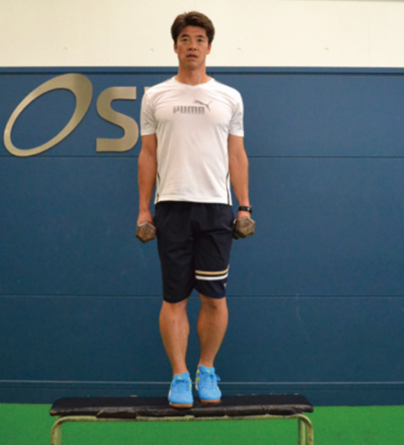 台の上に両足を乗せ、基本となる姿勢をキープする。上級者は写真のように錘を持ってもOK。