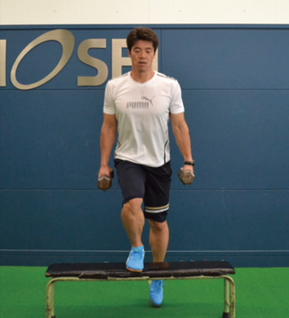 TRAINING 2は縦の動きになります。これは実際の走りに直結したトレーニングです。体幹は走るときなど、地面を蹴った際にブレやすいですが、それをトレーニングによって鍛えます。まずは台の上に両足を乗せて立ち、基本姿勢を保ちます。そこから片足を下げ、しっかりと地面に足をつけ、衝撃を吸収すると再び台へと足を戻します。TRAINING 1と同じく、上げ下げする膝が曲がらないことが大事。最初は何も持たなくても構いませんが、できるようになったら、写真のように両手に錘を持ったり、台を高くしてもいいでしょう。階段やタイヤの上など気軽にできるトレーニングなので、ちょうどいい高さを探してトライしてください。