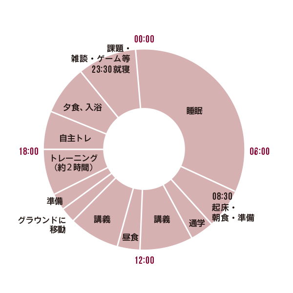 寮では朝食と夕食の時間が決まっていて、遅れると食べられないので、必然的に朝は8時半起床になります。講義は所沢キャンパスの日と東伏見キャンパスの日があります。教室で受ける講義以外にオンライン講義が週に2コマあって、これは空いている時間に部屋でパソコンを開いて受けます。練習に影響が出ないよう、4限以降の講義は履修しないよう調整しています。試合は土曜日か日曜日。基本的に現地集合なので、2時間前に到着できるよう準備をします。 ※この記事は2016年4月に掲載したものです。