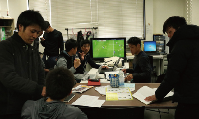 テレビ、PCが完備された研究作業室。試合映像の分析やスケジュール管理、情報の共有はここで行われ、部員たちの溜まり場(?)かつ勉強の場です。