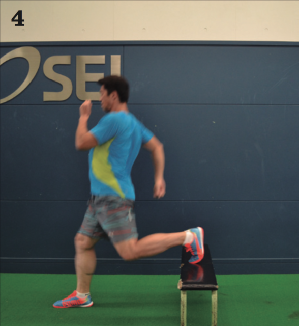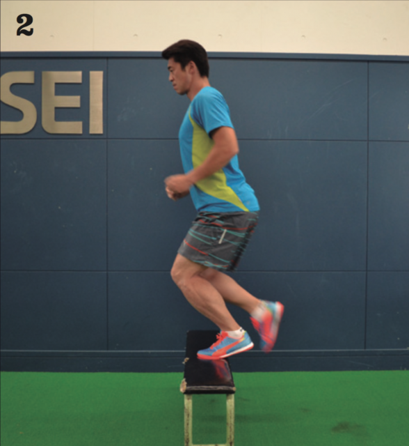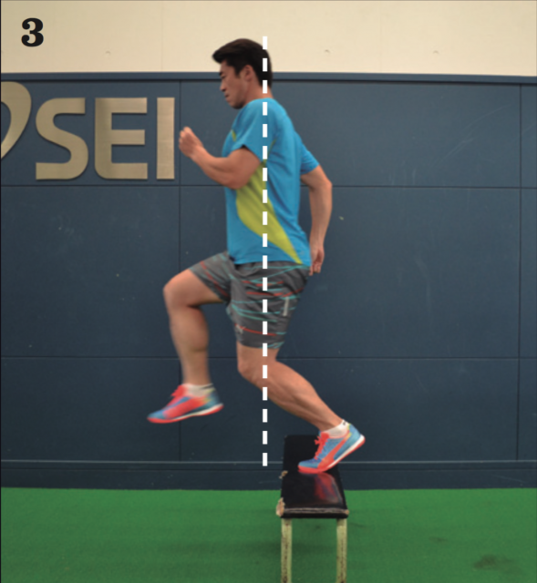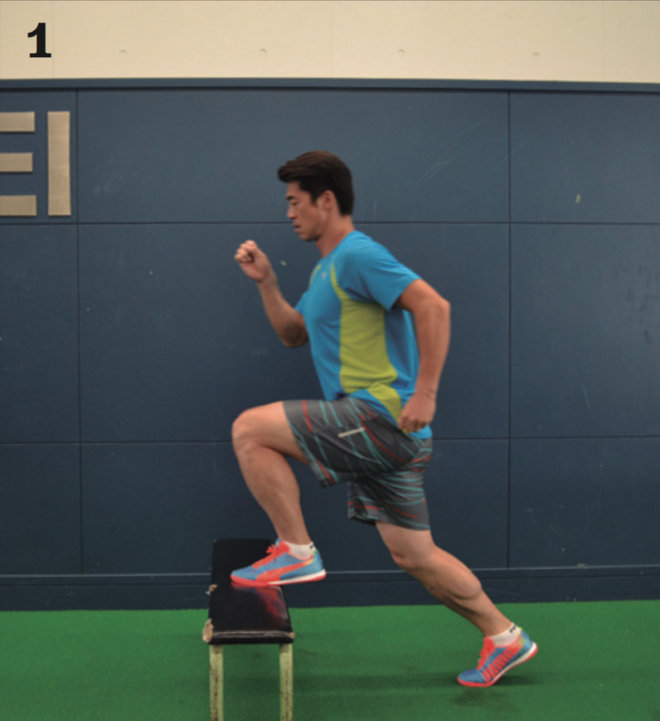 正しい姿勢から片足を台の上に乗せ、もう一方の足で台を越えていく。体勢を崩すことなくスムーズに体重移動することが目的のため、スピードはゆっくりでいい。早くやることよりも姿勢を崩さないことを優先してトレーニングしよう。ポイントとしては、台を越える際も、上半身の姿勢を崩さずに、身体の縦のラインを保ちながら、横に平衡移動していくイメージ。腰が前に出すぎたり、頭が前に出すぎたりすることなく、身体の縦のラインがそのまま移動していくことを意識してほしい。戻る際は普通に戻って OKだ。