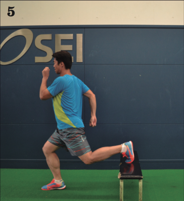 決して足は遅いほうではないのに、ドリブルするとスピードが上がらない。そう悩んでいる選手も多いのではないか。もしかしたら、その一因は体幹がぶれていることにあるかもしれない。フリーランニングやドリブルといった動作においてスムーズな体重移動は、競り合いで相手よりも一歩先に出たり、優位に立つポイントとなる。ドリブル時に身体のバランスを崩せば、わずかではあっても余計に距離がかかってしまうし、余分な動作も加わってしまう。さらには地面に対して重心を掛けたときにうまく伝わらない要因にもなる。走りながら正しく、かつスムーズな体重移動を身につけるのは難しいため、それを掘り下げ、ゆっくりとした確認作業によって身につけていくトレーニングをオススメしたい。今回のトレーニングは筋力よりも自分の身体に対する空間認知や重心移動に注意を払うことがすごく重要となる。まず、用意した台に片足を乗せ、もう片方の足を使って、ゆっくりと台の反対側へと越えていく。その際に正しい姿勢を崩さず、身体の縦のラインがそのまま平衡移動していく感覚を意識しよう。膝を曲げすぎず、余計な動作を入れないこともポイント。大きな鏡のある場所で確認する、映像に記録して確認するなどして、姿勢がぶれていないか、スムーズに体重移動できているかどうかをチェックしよう。
