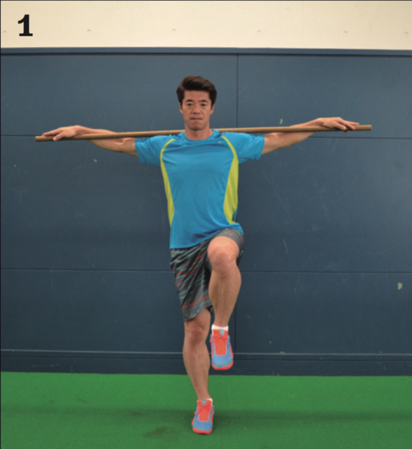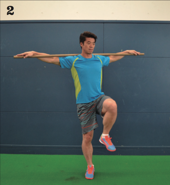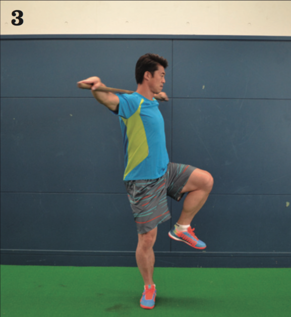 身体の片側に軸を作る体幹トレーニング。棒を用意し、肩に掛け両手を広げて持とう。棒をもつことで胸も張りやすくなり、正しい姿勢を保つことをサポートする。片足を上げ、軸足で体幹を保ちつつ、頭から足の先まで一体感を作り出す。そこから体幹を保ったままゆっくりと身体を回転させていく。このとき足だけが先に回ってしまったり、上半身だけが先に回ってしまったりすることなく、同時に回ることを心がけよう。バランスを保つのは非常に難しいので、ゆっくりでOK。身体に軸を作り回ることを重視しよう。