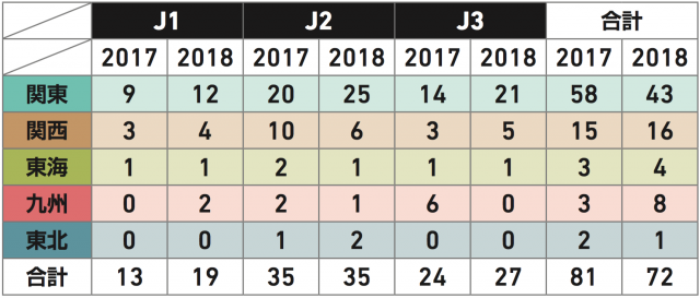2017・2018年の地域別Jリーグ加入選手割合