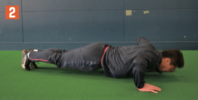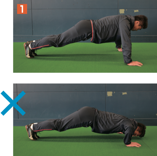 まず着目したいのが、見せる筋肉ではなく、使える筋肉を作ること。筋力をつけても、プレーで使える筋肉でなければ意味がない。ここではただ単に筋量を増やすのではなく、動ける筋肉をつける方法を紹介。動作としては、ゆっくりではなく、テンポよく、速いスピードで上げ下げすること。擬音での表現になるが「ストン」と下ろして「ギュッ」と力を入れて上げるイメージ。このとき体のラインが「くの字」や「のの字」になることなく、一直線に上げ下げすることで、体幹のトレーニングにもつながる。また、大きく上下させることで、肩胛骨周りのストレッチ効果も出る。練習前に行えば、より全身が使えるようになるはずだ。