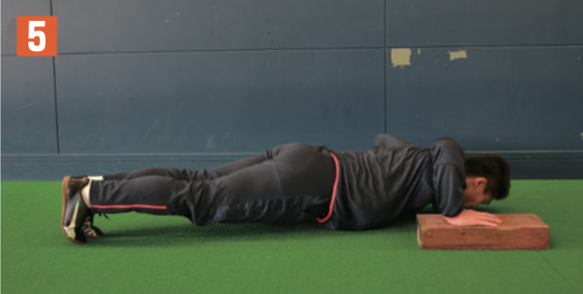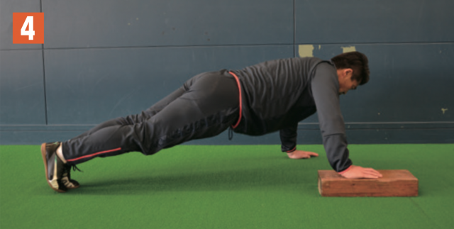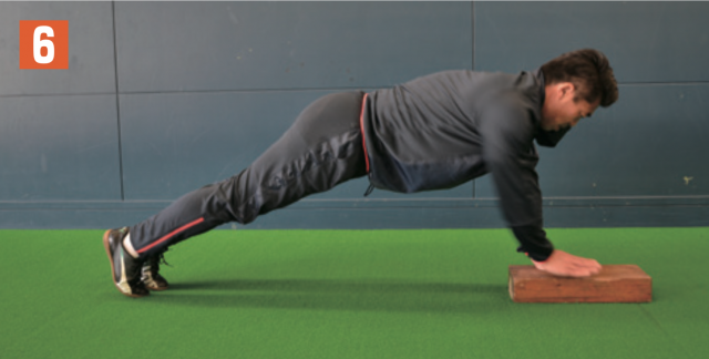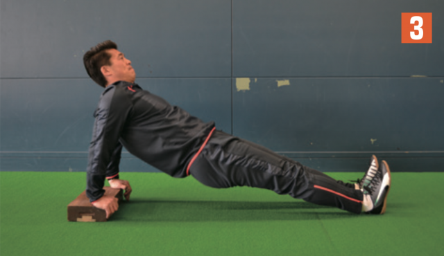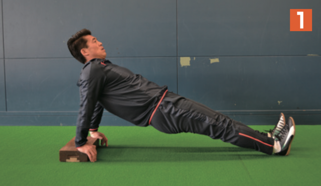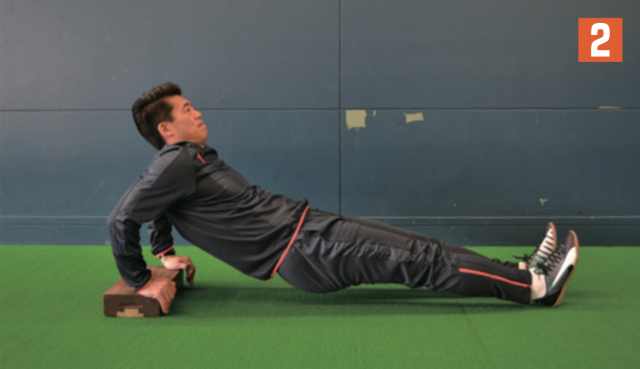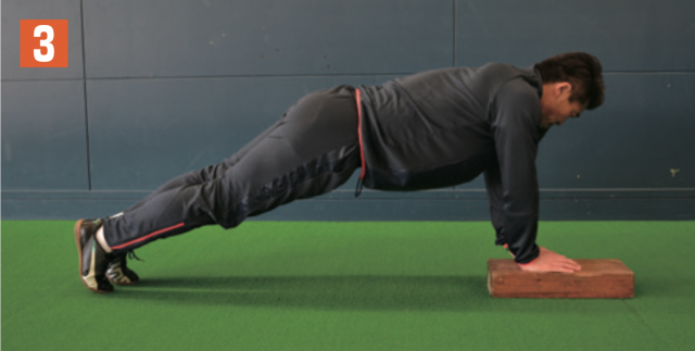 ブロックや板などの台の上に片手(写真1は左手)を置き、その場で腕立てふせを行う。肘を上げたら、体勢を保持しながら横に体重移動し、今度は先ほど、地面についていた片手(写2真2は右手)を台の上に置き、腕立てふせ。そして、また横に体重移動して逆の手を台の上に乗せて腕立てふせ。この動きを繰り返す。横に体重移動する際も体幹は維持する。