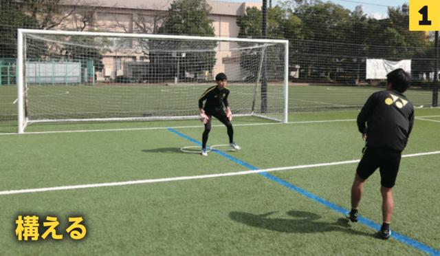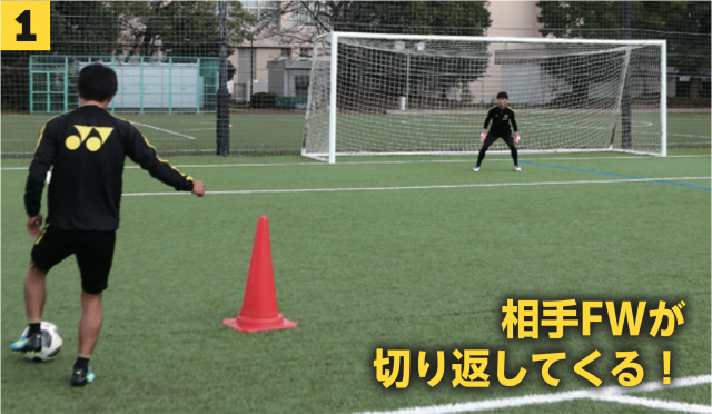 ❶GKはボールに対して正しいポジショニングを取る(写真では左足にボールを持っているFWに対してポジショニング)