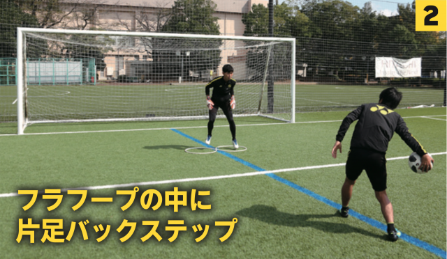 フラフープは真後ろに下がるための意識付け。良いタイミングとは両足が地面から離れたときにパートナーがボールを投げていること。スタートの合図を決めておくのもいいが、最終的にはGKが合わせられると実戦に近づく。